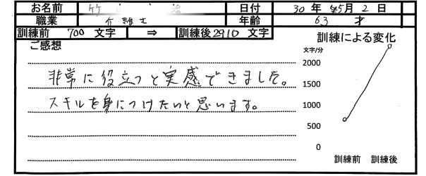 【受講前】 分速600文字 → 【受講後】分速1,020文字 1.7倍UP!自分でも訓練すればできるのだという自信ができました。